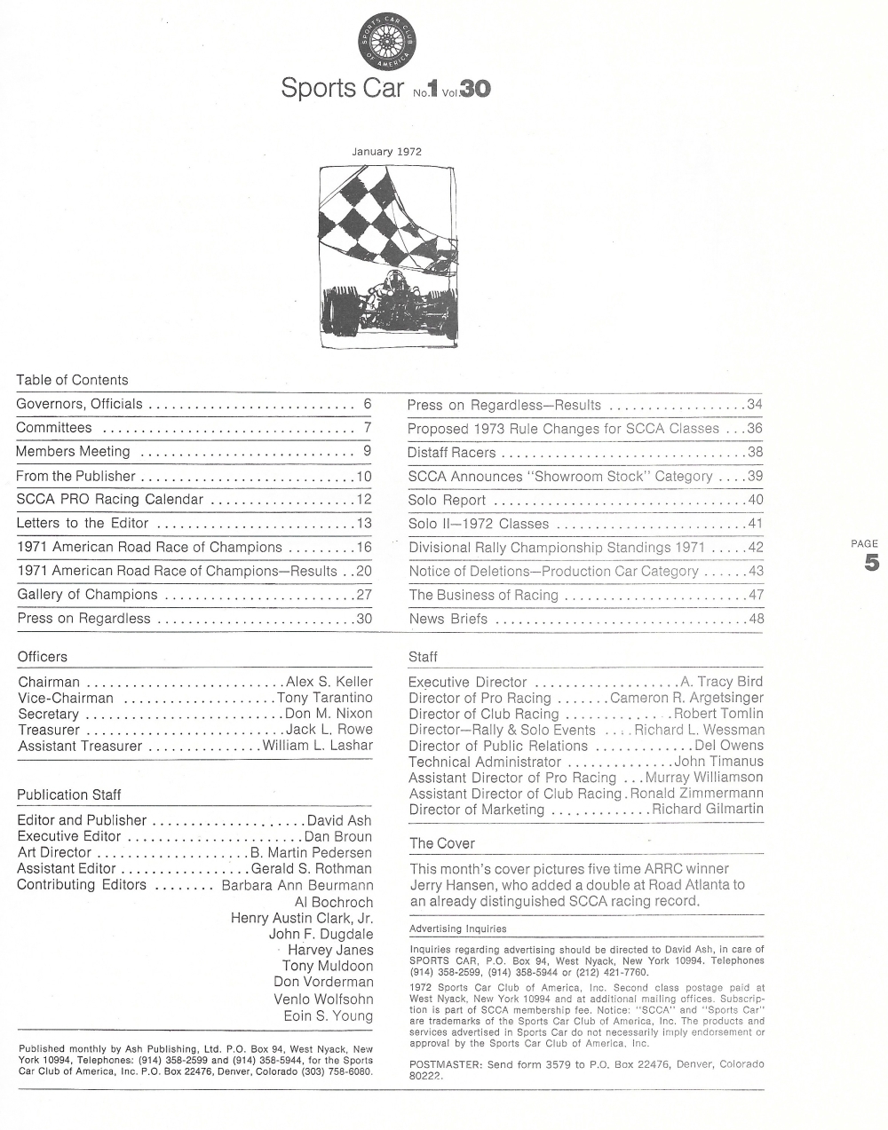 Reviews SPORTS CAR 1972 JAN - '71 PRO RACING SCHEDULE, GALLERY OF CHAMPS