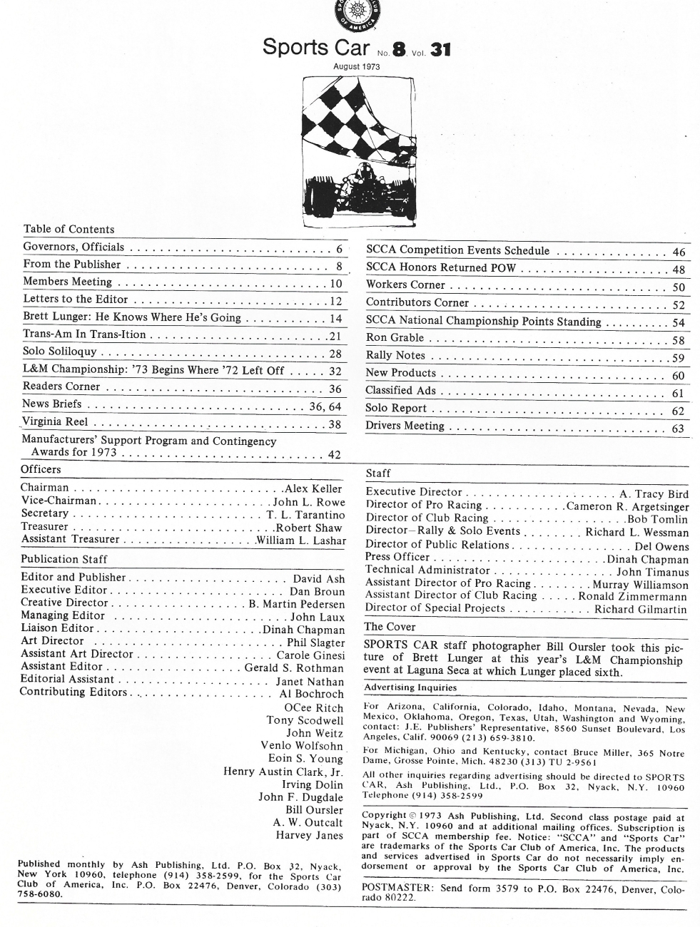 Reviews SPORTS CAR 1973 AUG - BRETT LUNGER, L&M CHAMPIONSHIP