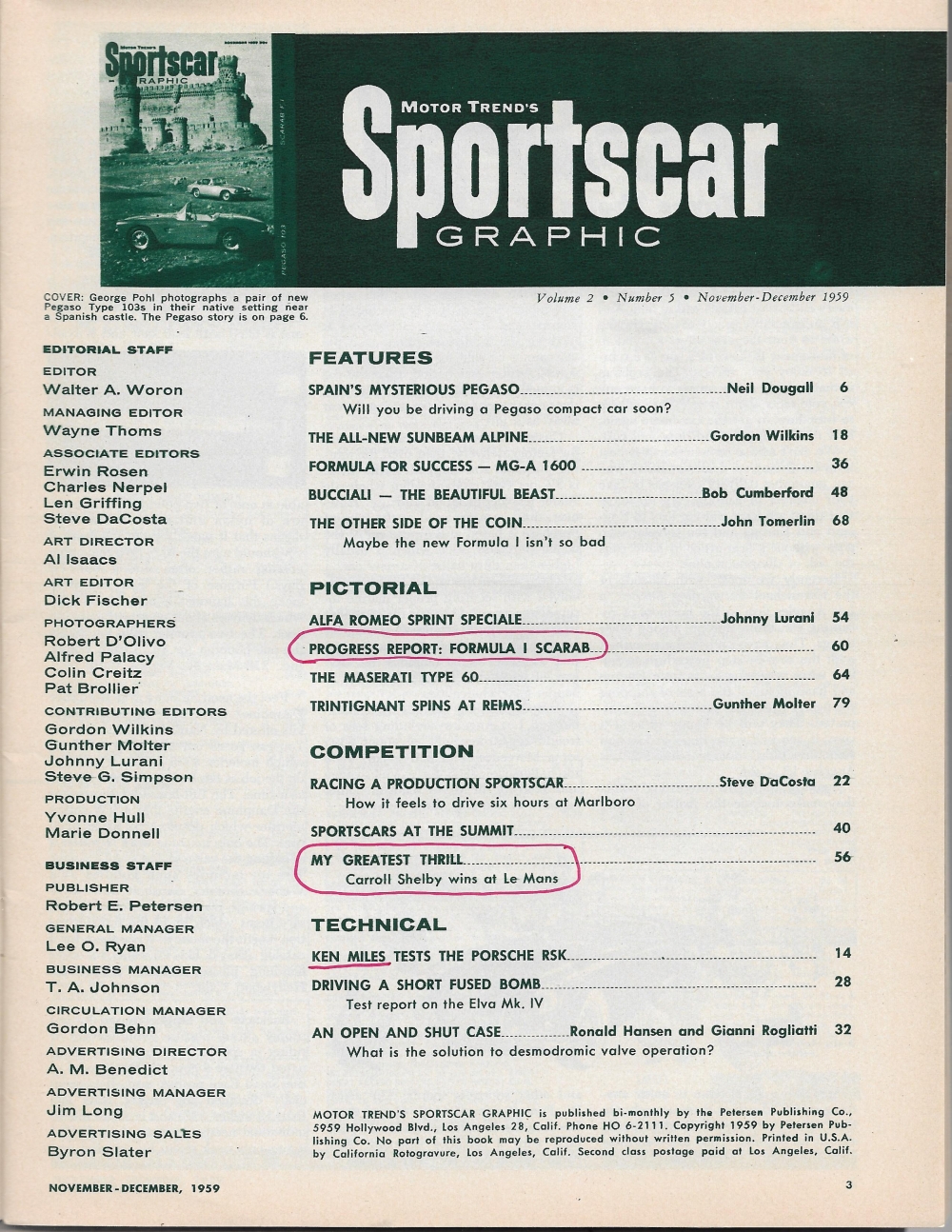 Reviews SPORTS CAR GRAPHIC 1959 DEC - SCARAB F1, ELVA-4, SHELBY, MGA, PEGASO