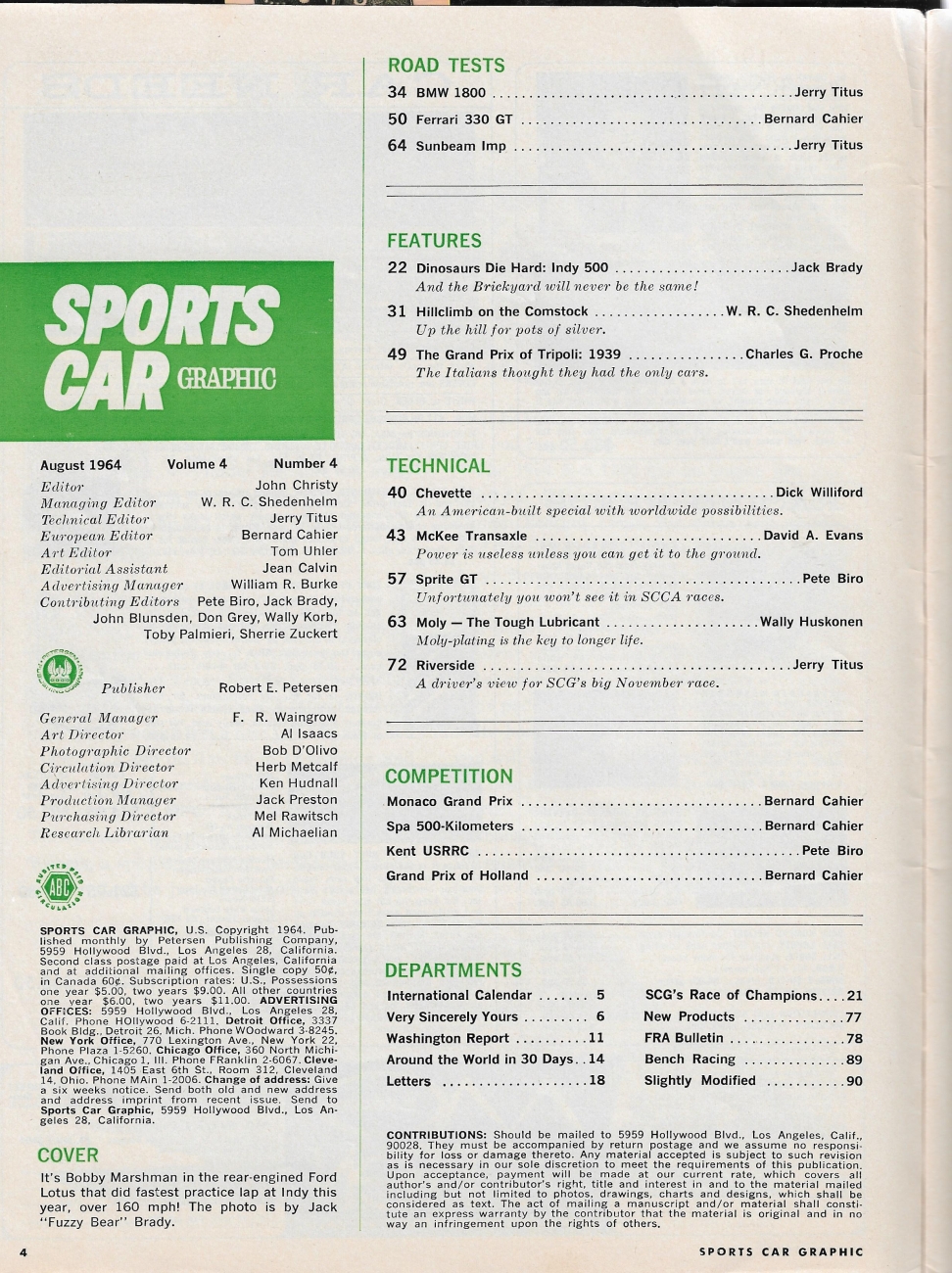 Reviews SPORTS CAR GRAPHIC 1964 AUG - INDY, BMW 1800, 330GT, McKEE CHEVETTE