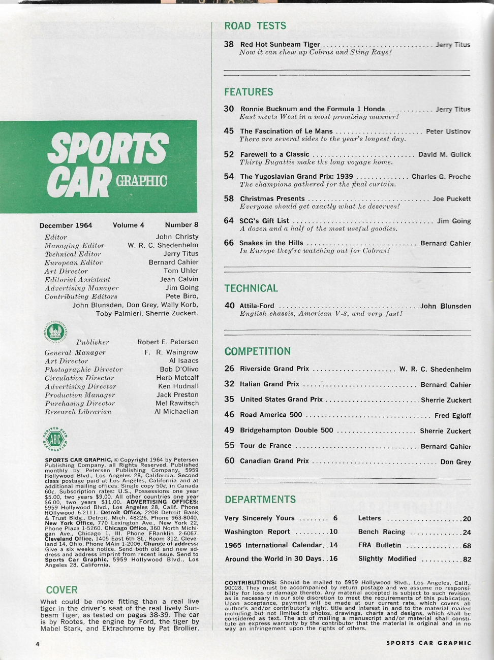 SPORTS CAR GRAPHIC 1964 DEC - TIGER, RIVERSIDE, ATTILA-FORD, BUGATTI