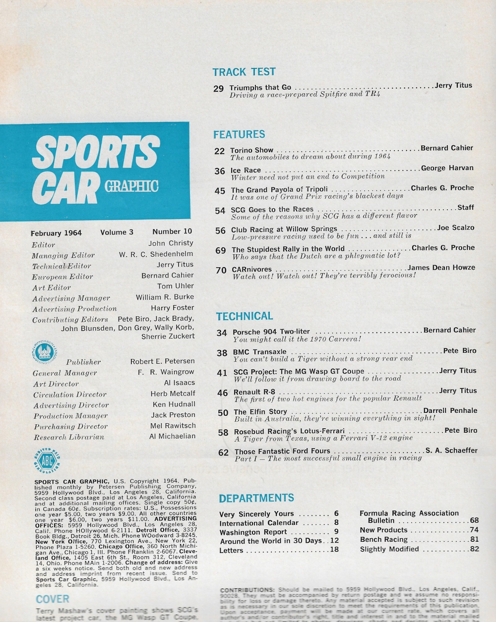 Reviews SPORTS CAR GRAPHIC 1964 FEB - TRIUMPHs, PORSCHE 904, RENAULT R8, ELFIN