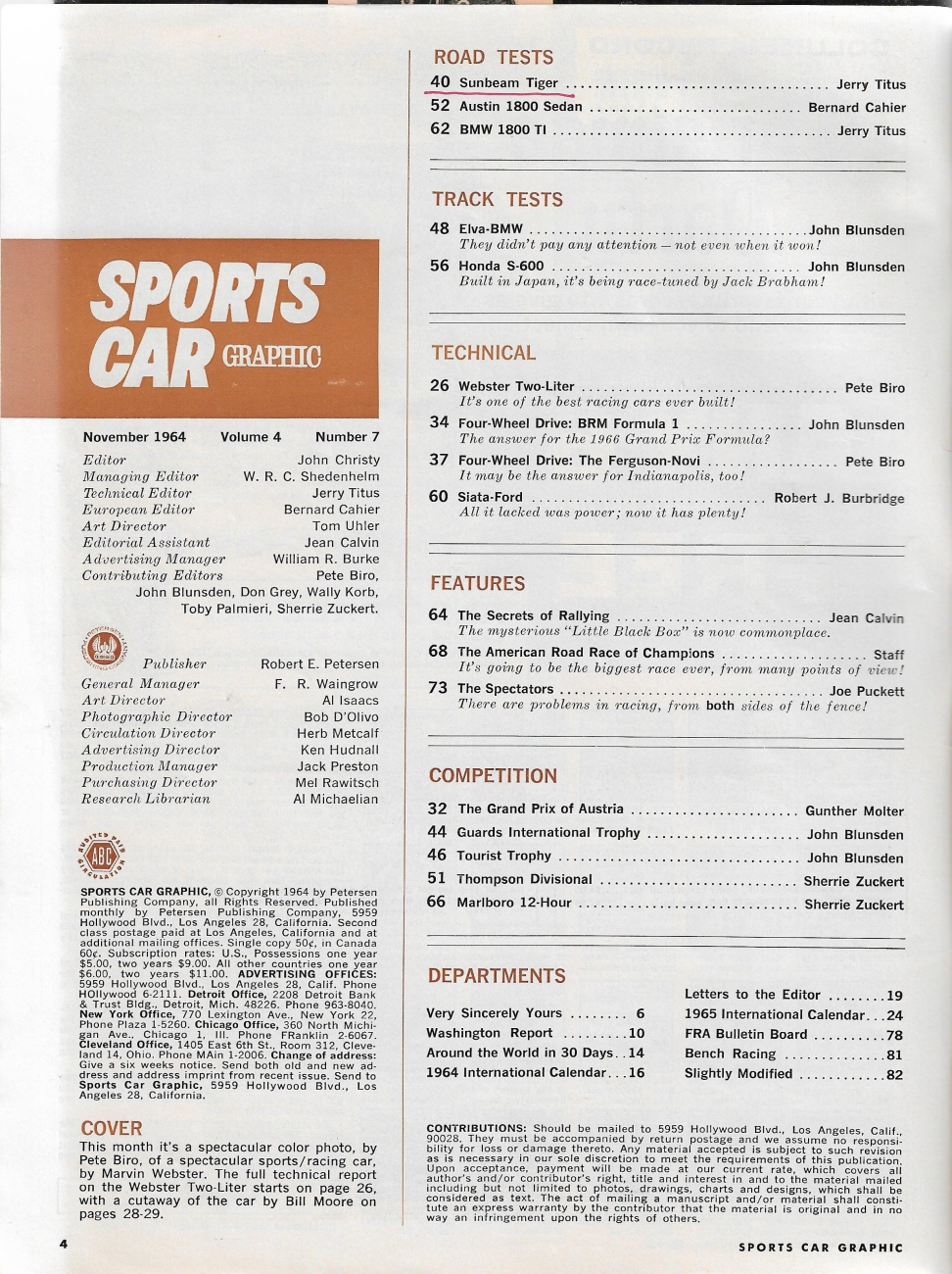 Reviews SPORTS CAR GRAPHIC 1964 NOV - WEBSTER, SIATA-FORD, TIGER, ELVA-BMW