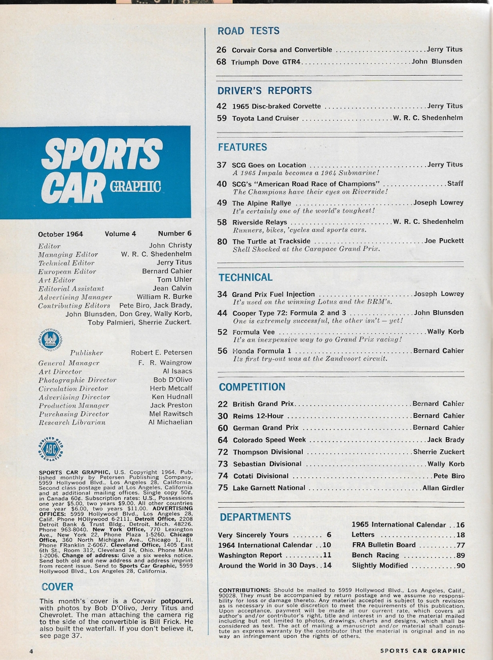 Reviews SPORTS CAR GRAPHIC 1964 OCT - CORVAIR CORSA, VETTE, TRIUMPH GTR4