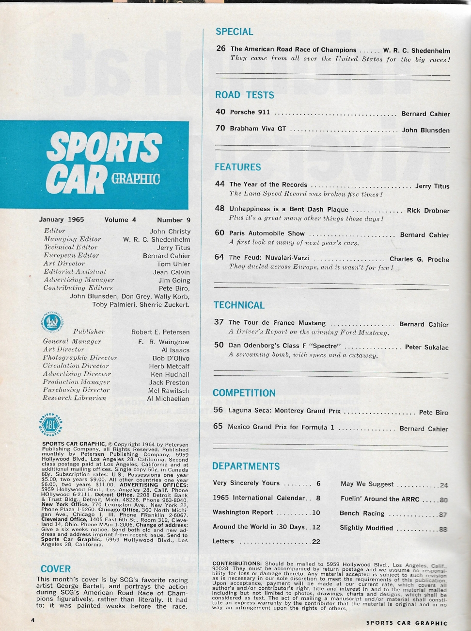 Reviews SPORTS CAR GRAPHIC 1965 JAN - BRABHAM VIVA GT, SCEPTRE, 911, MUSTANG