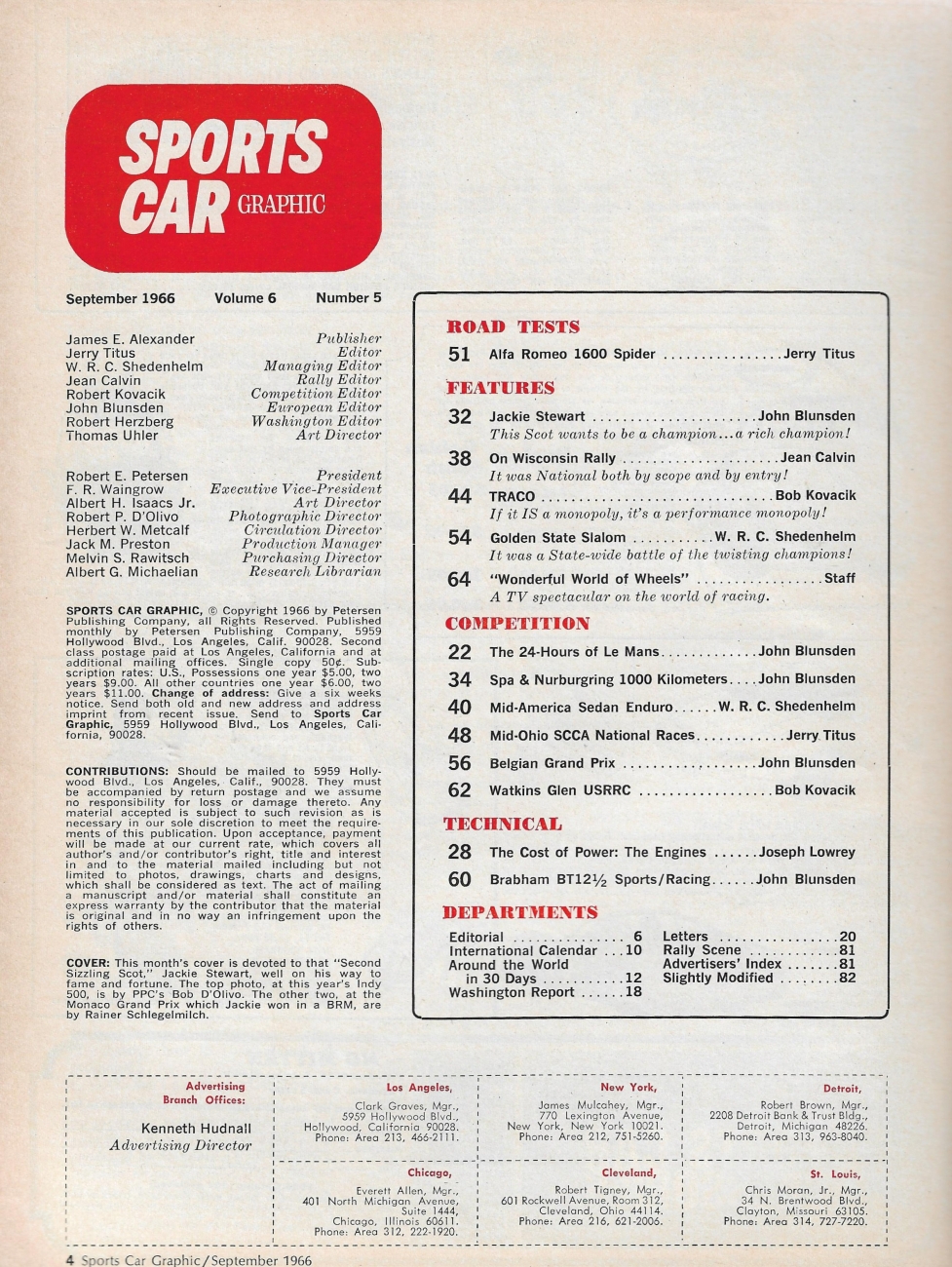 Reviews SPORTS CAR GRAPHIC 1966 SEPT - ALFA 1600 SPIDER, STEWART, BT12 1/2