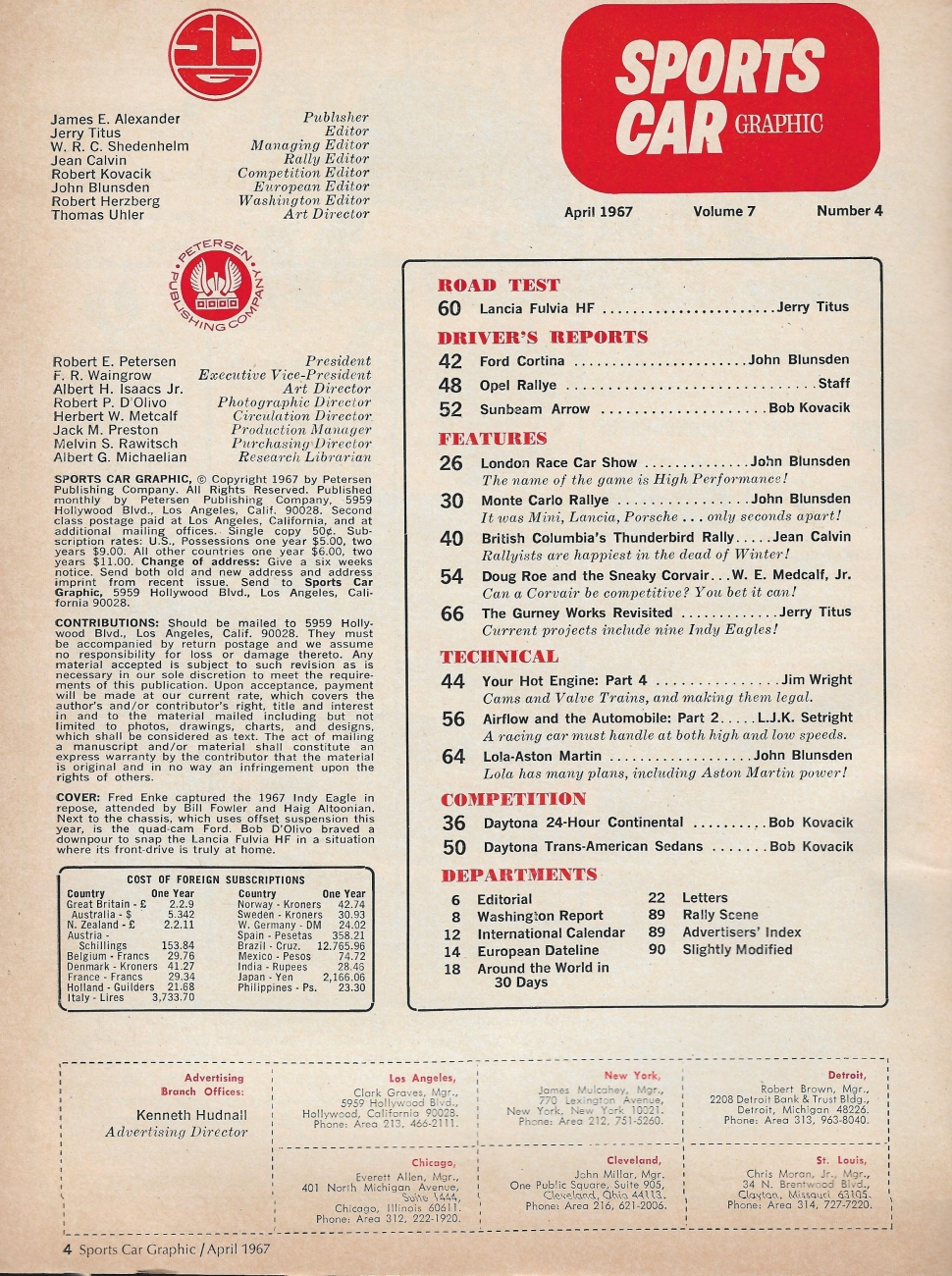 Reviews SPORTS CAR GRAPHIC 1967 APR - LANCIA FULVIA HF, OPEL RALLYE, CORTINA