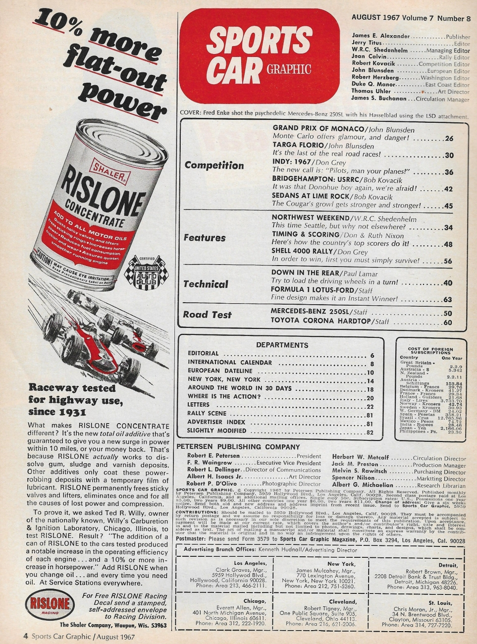 Reviews SPORTS CAR GRAPHIC 1967 AUG - 250SL, CORONA HARDTOP, LOTUS-FORD F1