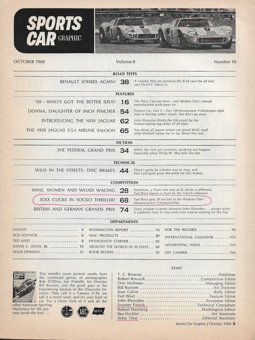 Reviews SPORTS CAR GRAPHIC 1968 OCT - NEW PONY CARS, XJ6 & SSI AIRLINE JAGS
