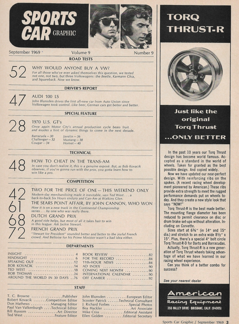 Reviews SPORTS CAR GRAPHIC 1969 SEPT - VW Spcl, AMC HORNET, PONY CARS, AUDI