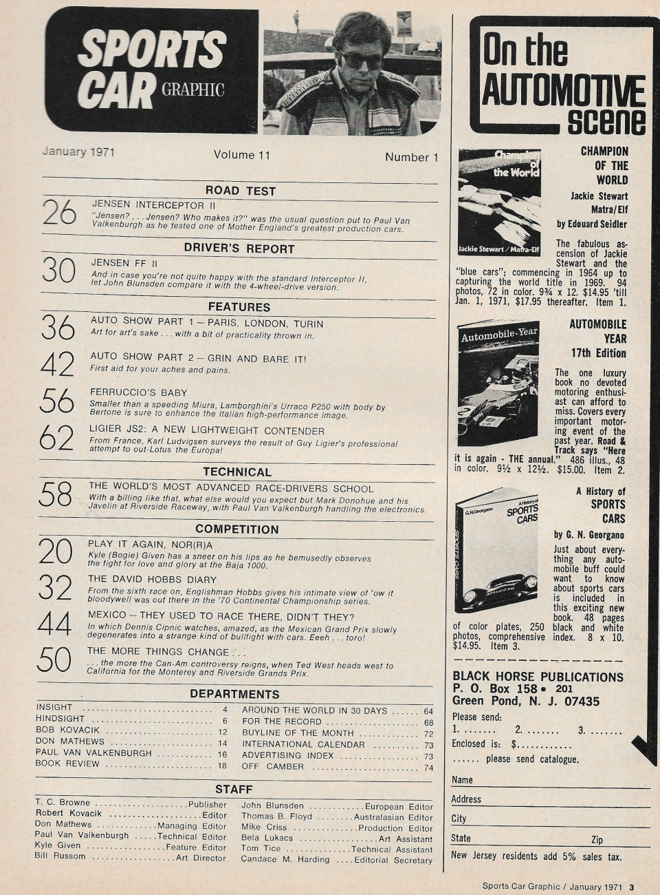 Reviews SPORTS CAR GRAPHIC 1971 JAN - URRACO, INTERCEPTOR II, LIGIER JS2