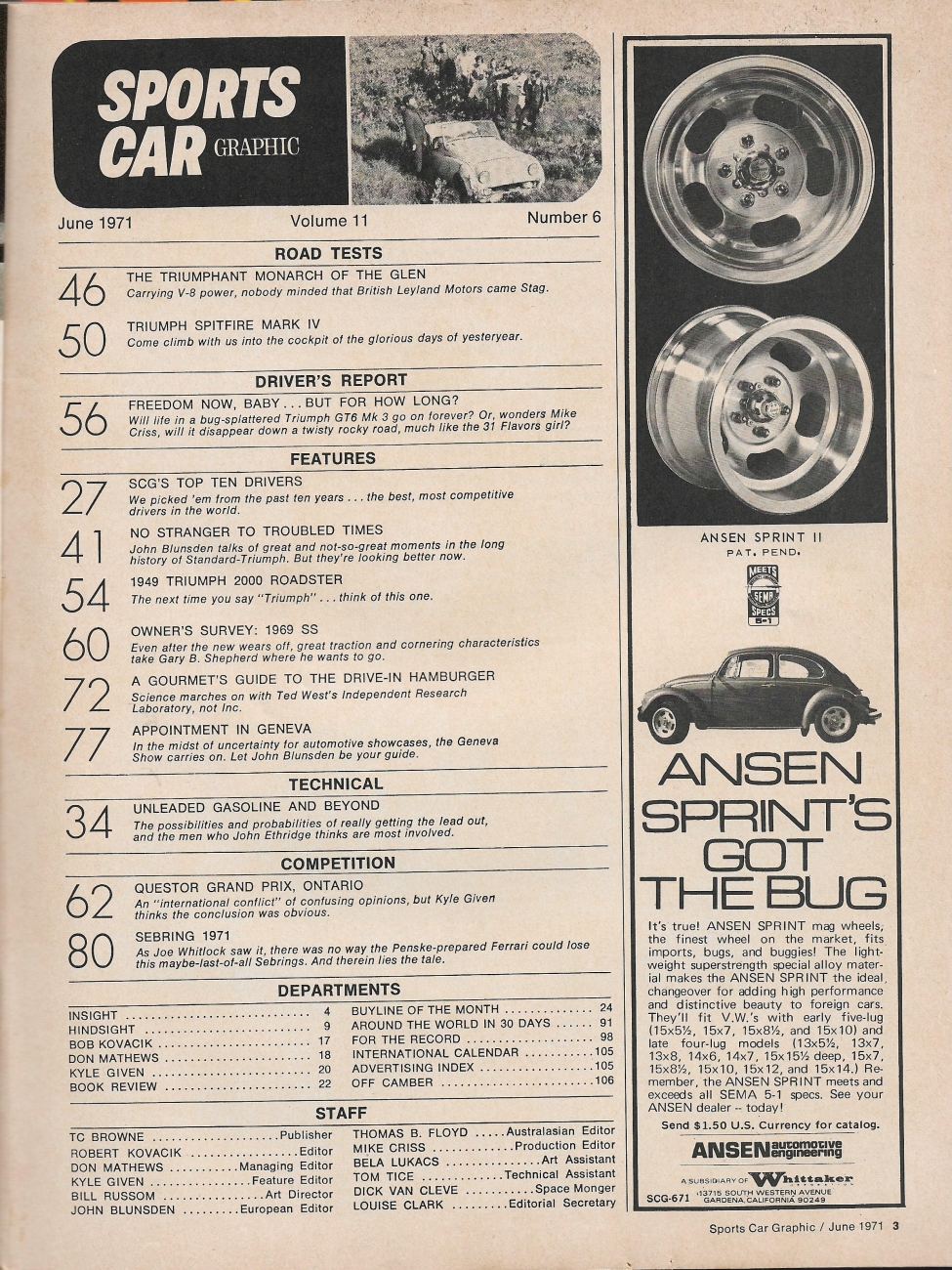 Reviews SPORTS CAR GRAPHIC 1971 JUNE - TRIUMPH Spcl, SEBRING, TOP 10 DRIVERS*