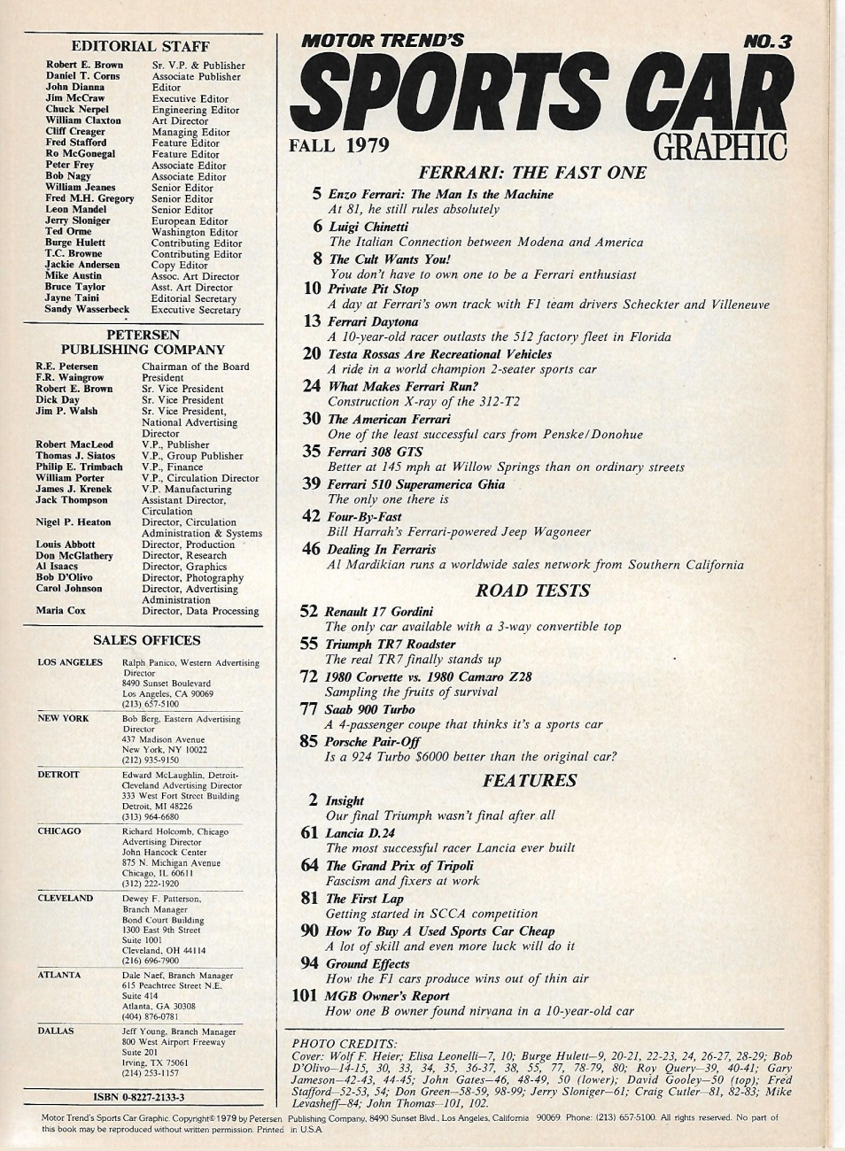 Reviews SPORTS CAR GRAPHIC 1979 #3 FALL - FERRARI Spcl,MGB,VETTE v Z-28,924 v 924 TURBO