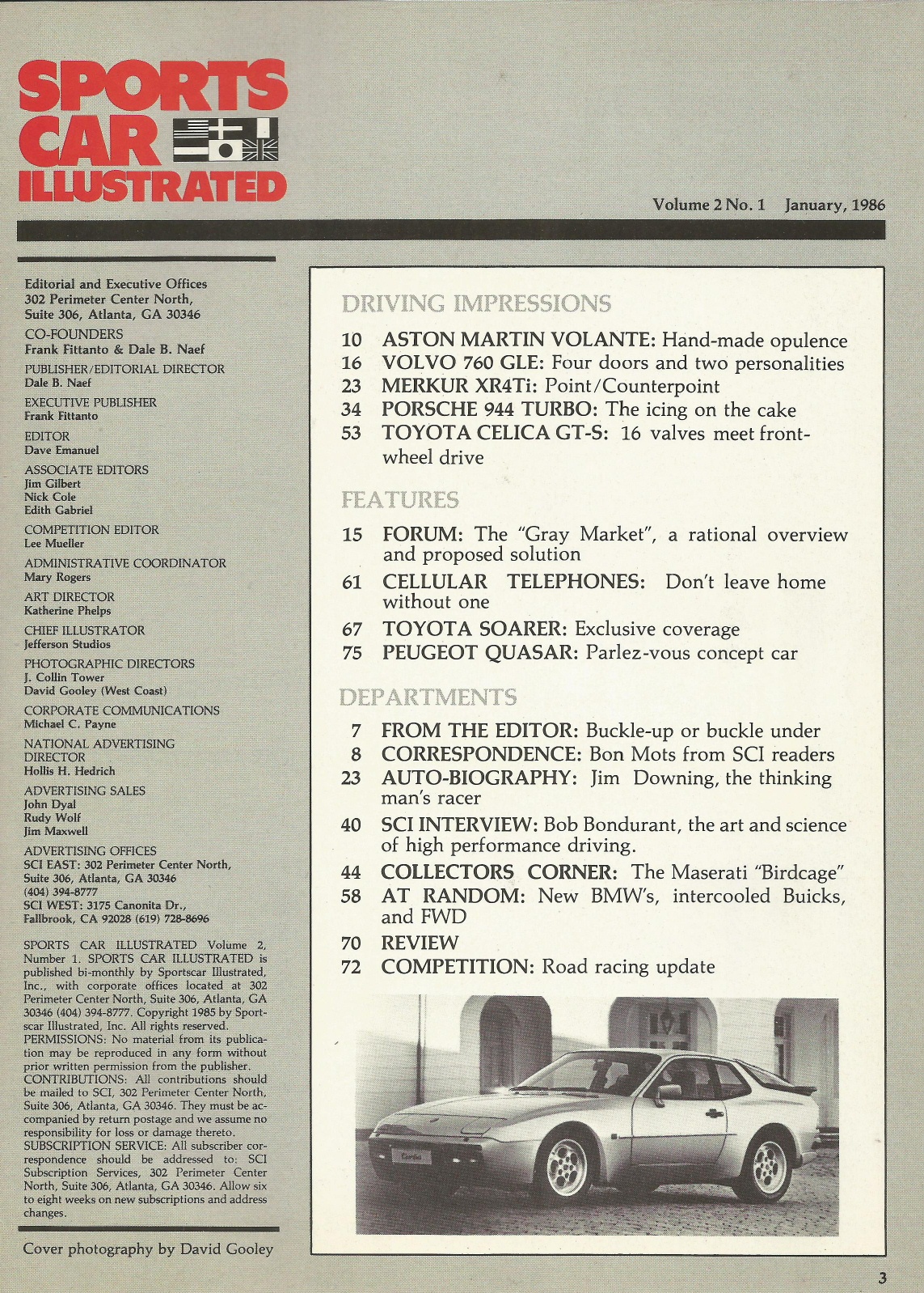 Reviews SPORTS CAR ILLUSTRATED 1986 JAN - VOLANTE, XR4Ti, 944-T, BONDURANT, BIRDCAGE