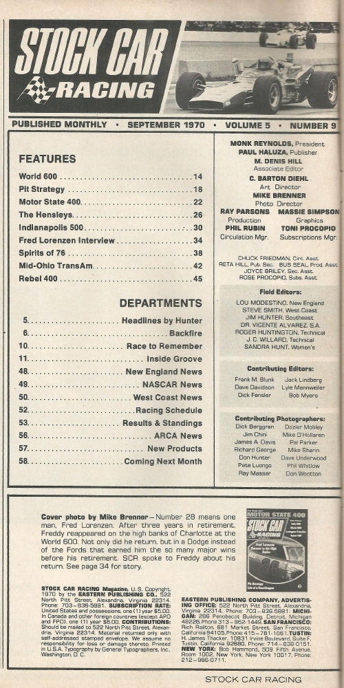 Reviews STOCK CAR RACING 1970 SEPT - LORENZEN RETURNS, Spirits of 76, Hensleys