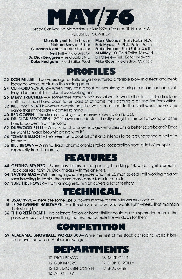 Reviews STOCK CAR RACING 1976 MAY - BERGGREN,ELLIOT,PEELE,Slater,Coffin,Miller, Brown