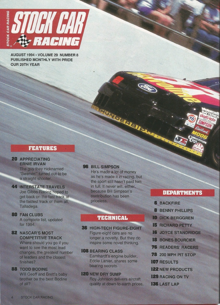 Reviews STOCK CAR RACING 1994 AUG - Irvan, Gibbs, Bodine, Simpson, Bearings, Sumps