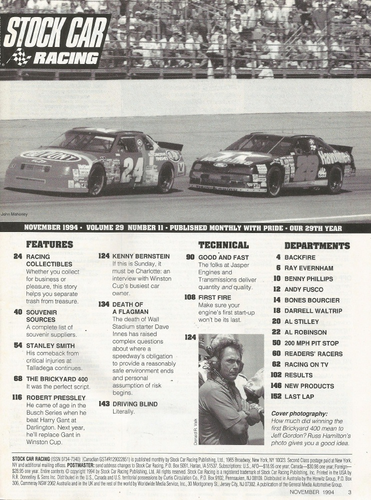 Reviews STOCK CAR RACING 1994 NOV - Stanley Smith, Pressley, Bernstein, Jasper Engines