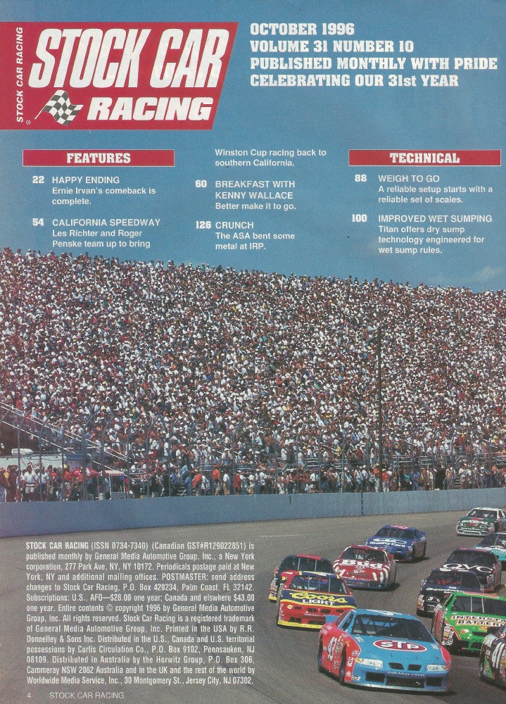 Reviews STOCK CAR RACING 1996 OCT - Ernie Irvan, California Speedway, Kenny Wallace