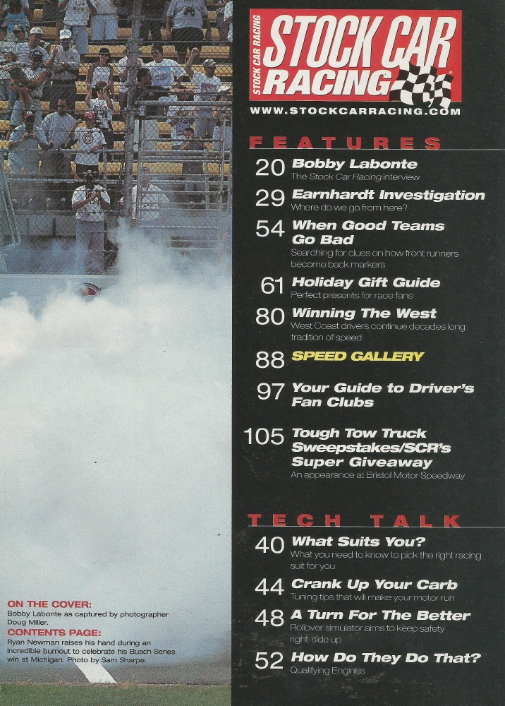 Reviews STOCK CAR RACING 2001 DEC - Labonte, Earnhardt Investigation, Carbs, Suits