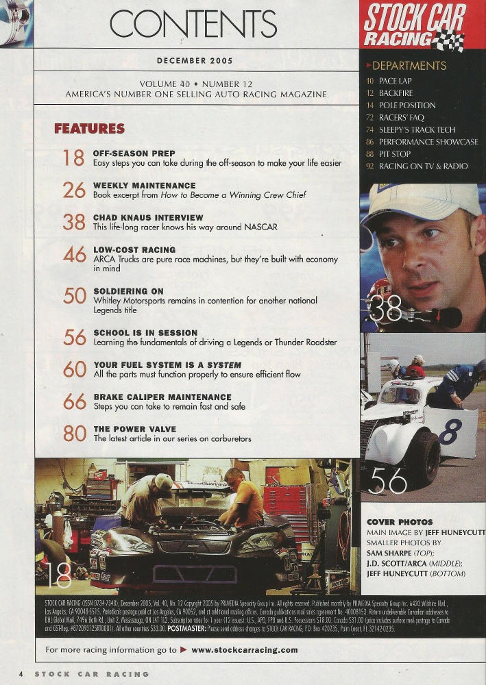 Reviews STOCK CAR RACING 2005 DEC - Knaus, ARCA Trucks, Whitley, Fuel, Brakes, Carbs