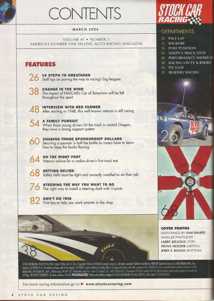 Reviews STOCK CAR RACING 2006 MAR - Farmer, Advice to rookies, Safety Belts, Steering