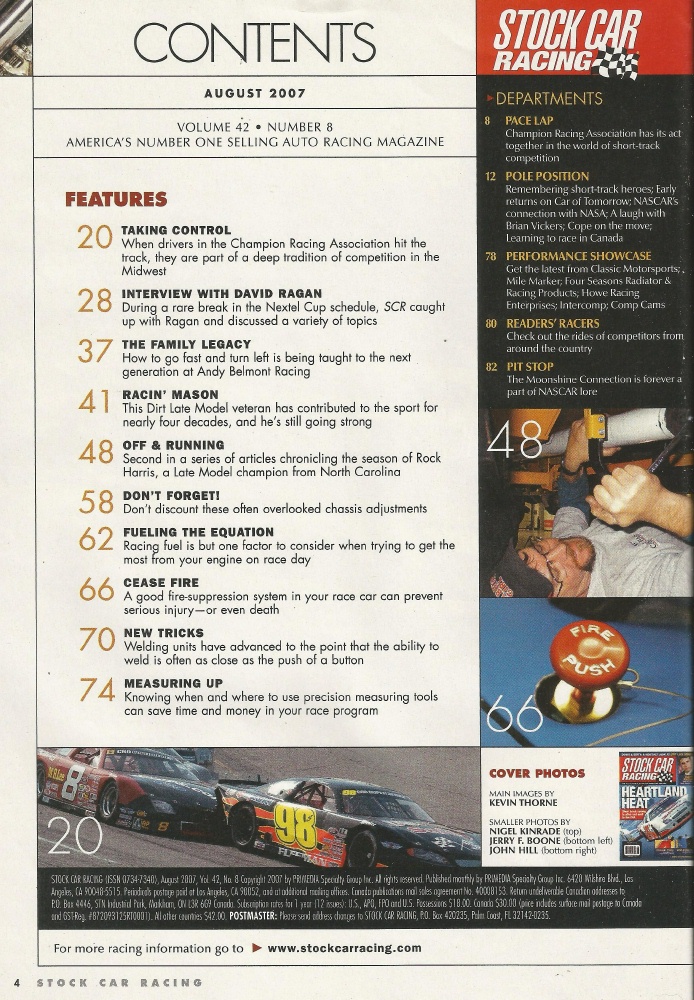 Reviews STOCK CAR RACING 2007 AUG - Ragan, Racin' Mason, Fuel, Fire, Welding, Harris