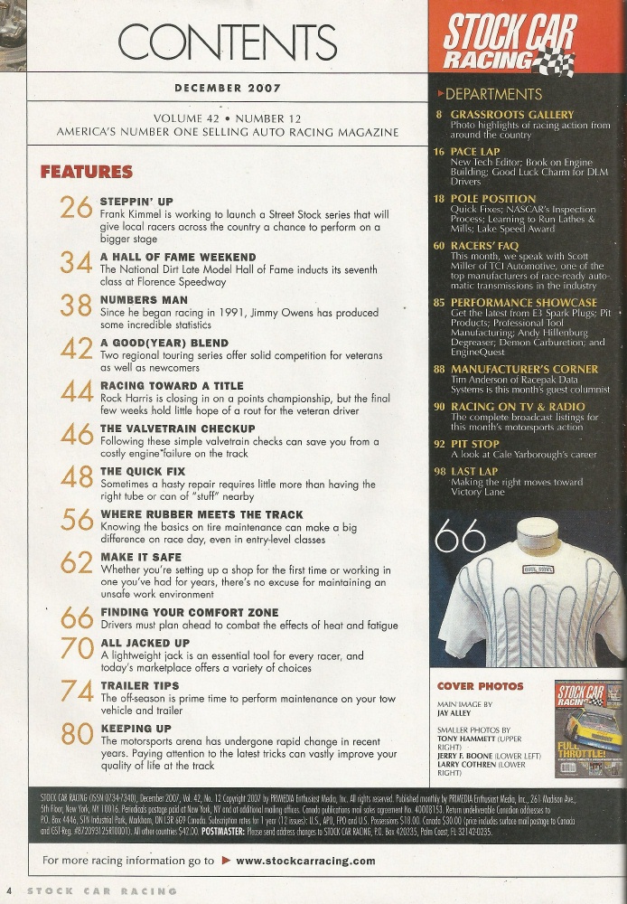 Reviews STOCK CAR RACING 2007 DEC - Kimmel, Owens, Valvetrain, Harris, Good Year