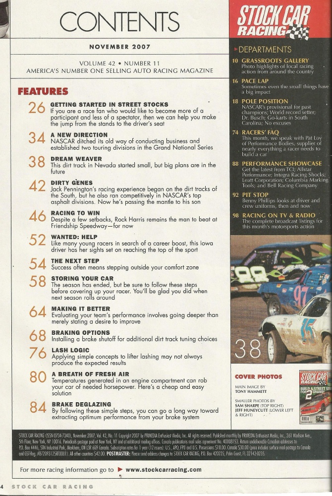 Reviews STOCK CAR RACING 2007 NOV - Pennington, Harris, Brakes, Lifter Lashing