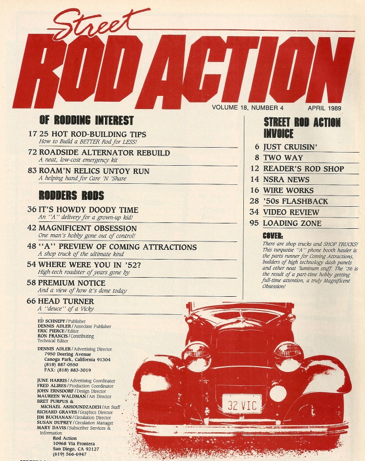 Reviews STREET ROD ACTION 1989 APR - HOT ROD BUILD TIPS,'29 FORD HOWDY DOODY DELIVERY