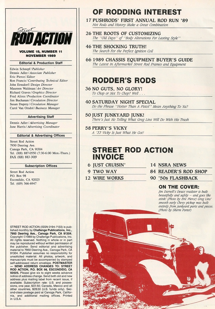 Reviews STREET ROD ACTION 1989 NOV - CHASSIS SPCL,IGNITION UPGRADE, ROOTS OF CUSTOMIZING