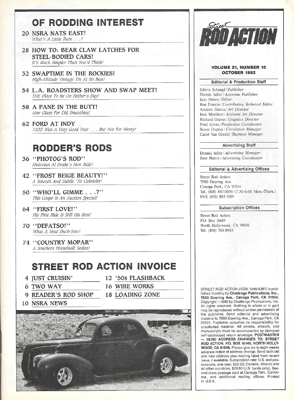 Reviews STREET ROD ACTION 1992 OCT - BEAR CLAW LATCHES,V-BUTT WIND SHIELDS, NSRA NATS E