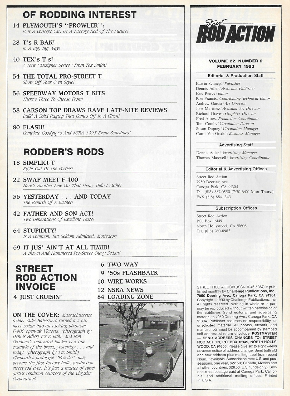 Reviews STREET ROD ACTION 1993 FEB - XR-6 & T'S OF THE FUTURE, PROWLER, T-ROADSTER