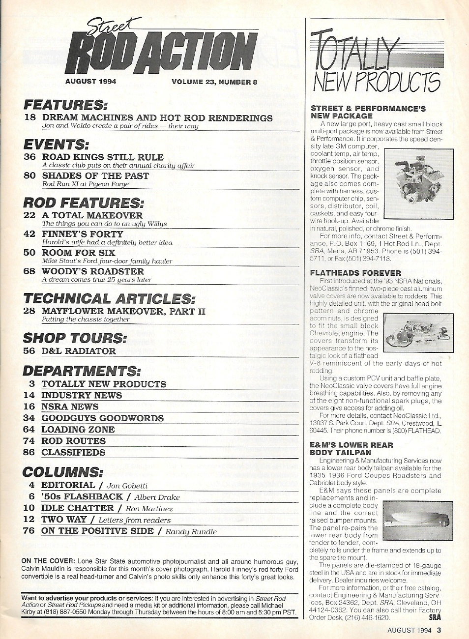 Reviews STREET ROD ACTION 1994 AUG - FINNEY'S '40, ROAD KING CAR SHOW, D&L RADIATOR SHOP