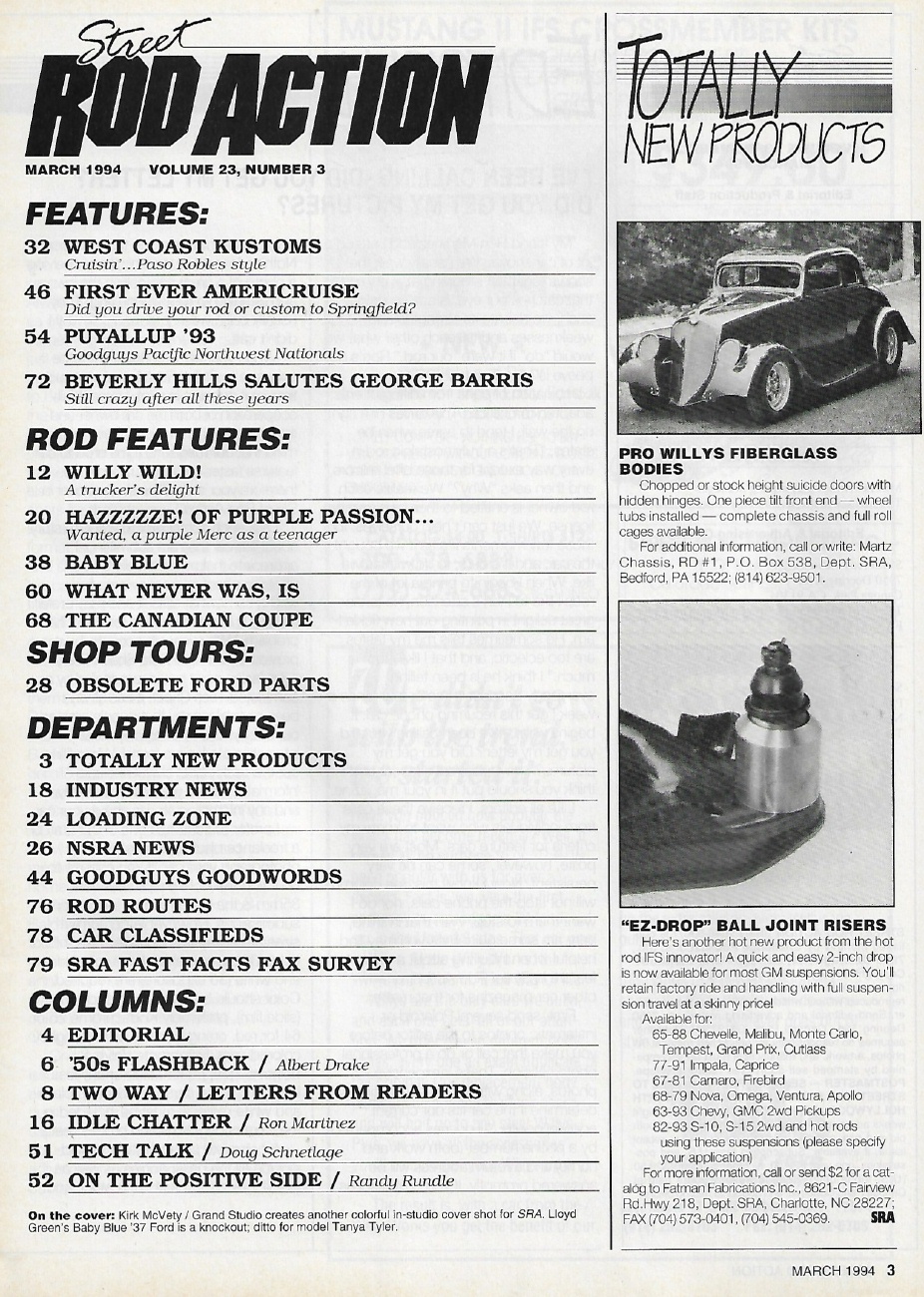 Reviews STREET ROD ACTION 1994 MAR - GREEN'S BABY BLUE '37, KUSTOMS CRUISE, AMERICRUISE
