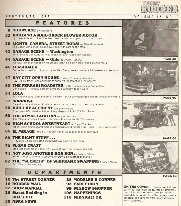 Reviews STREET RODDER 1986 SEPT - KEN BERRY, FERRARI V12 ROADSTER, EL MIRAGE LIVES