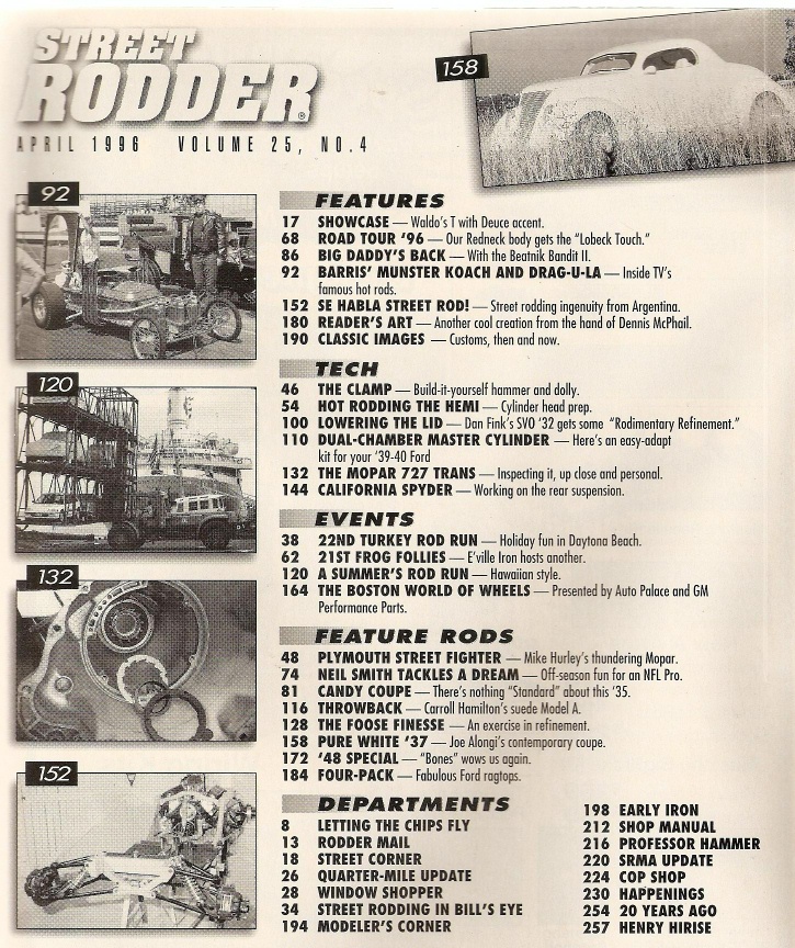 Reviews STREET RODDER 1996 APR - HEMI HEAD PREP, 727 TRANNY, FOOSE 41 FORD, FROGS