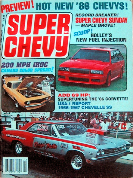 SUPER CHEVY 1985 NOV - L/78/L89 CHEVELLE, 409 IMPALA Within this issue you will discover the following topics: 1) Super Chevy Sunday at 2) A wild '80 Corvette 3) An injected V8 Vega 4) A lovely '66 S/ST Nova 5) A wicked '69 L78/L89 Chevelle SS 6) A nasty '62 409 Impala 7) A couple of tech reports thrown in for fun Plus many other hot Chevy items. |