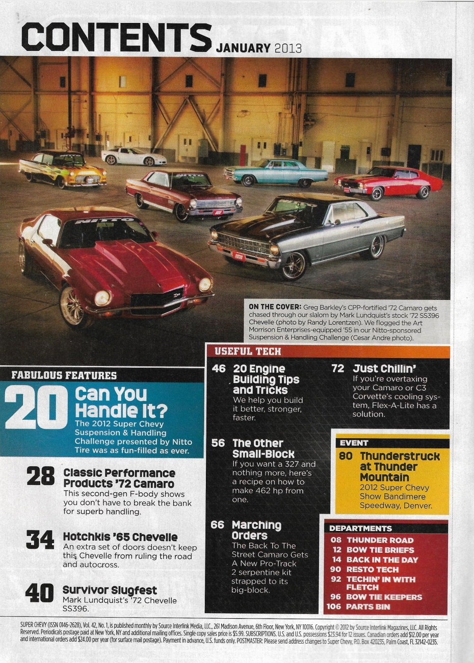 Reviews SUPER CHEVY 2013 JAN - SUSPENSIONS, '72 CHEVELLE SS, CPP CAMARO, 327 BUILD