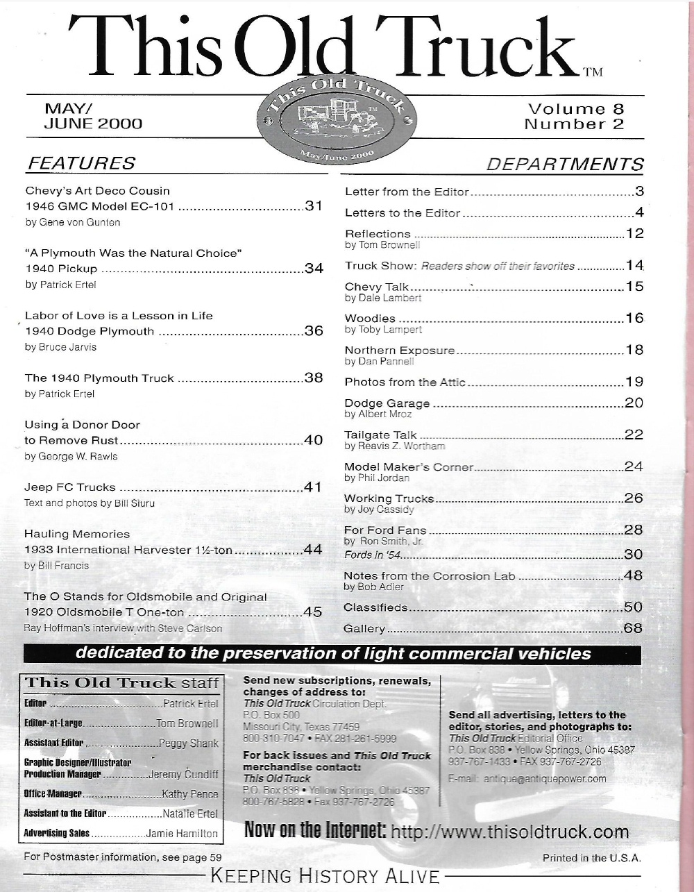 Reviews THIS OLD TRUCK 2000 MAY - '40 DODGE PLYMOUTH, '46 GMC MEDEL ED-101, '20 OLDS T