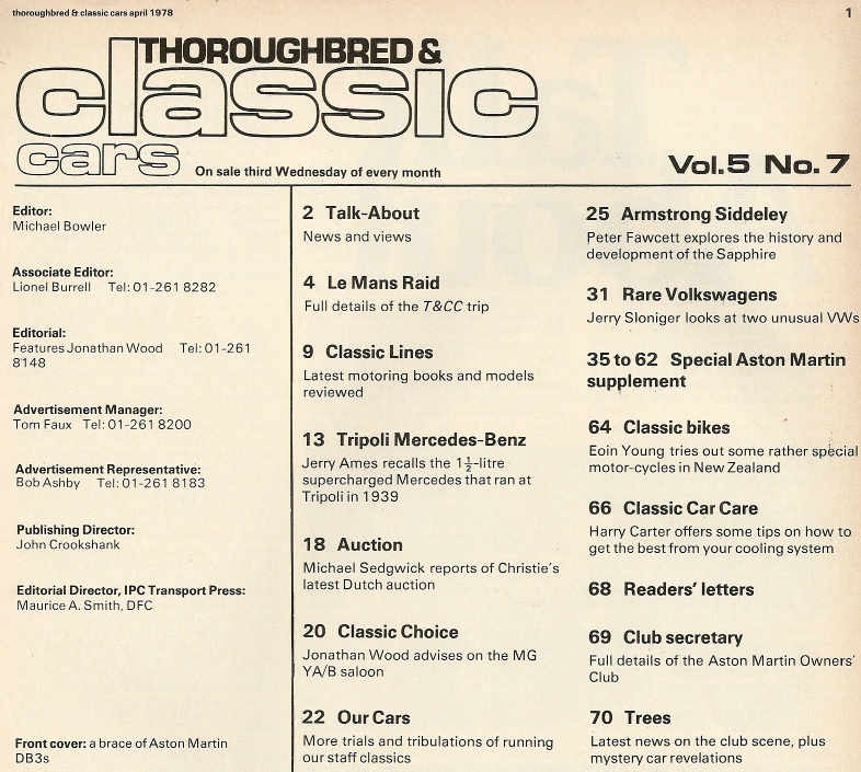 Reviews THOROUGHBRED & CLASSIC CARS 1978 APR - ASTON MARTIN Spcl, SAPPHIRE, MG YA/B