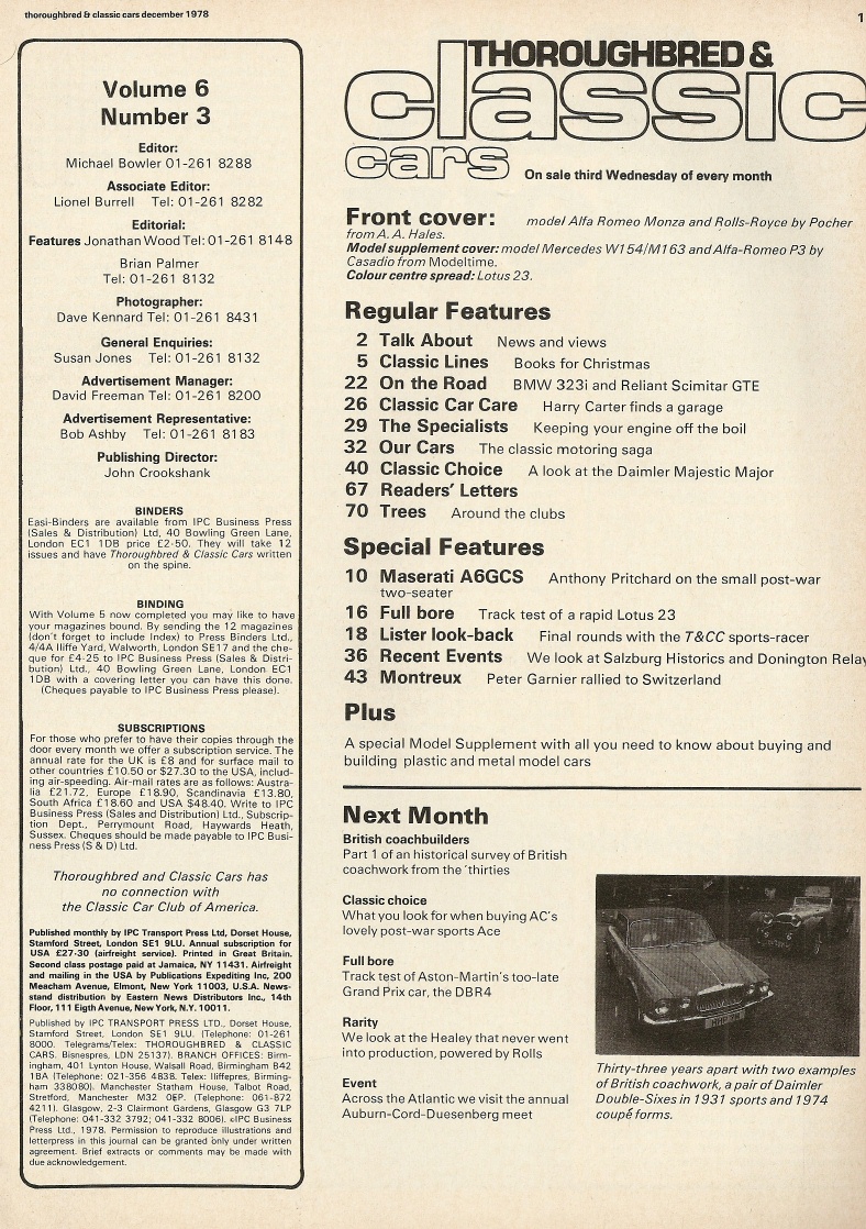 Reviews THOROUGHBRED & CLASSIC CARS 1978 DEC - LOTUS 23, MAJOR,ALPHA MONZA, ROLLS ROYCE