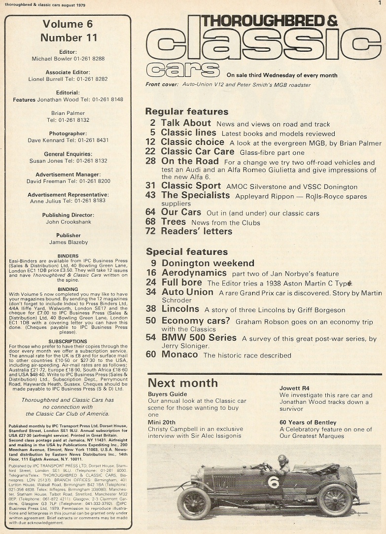 THOROUGHBRED & CLASSIC CARS 1979 AUG - ASTON C, BMW 500