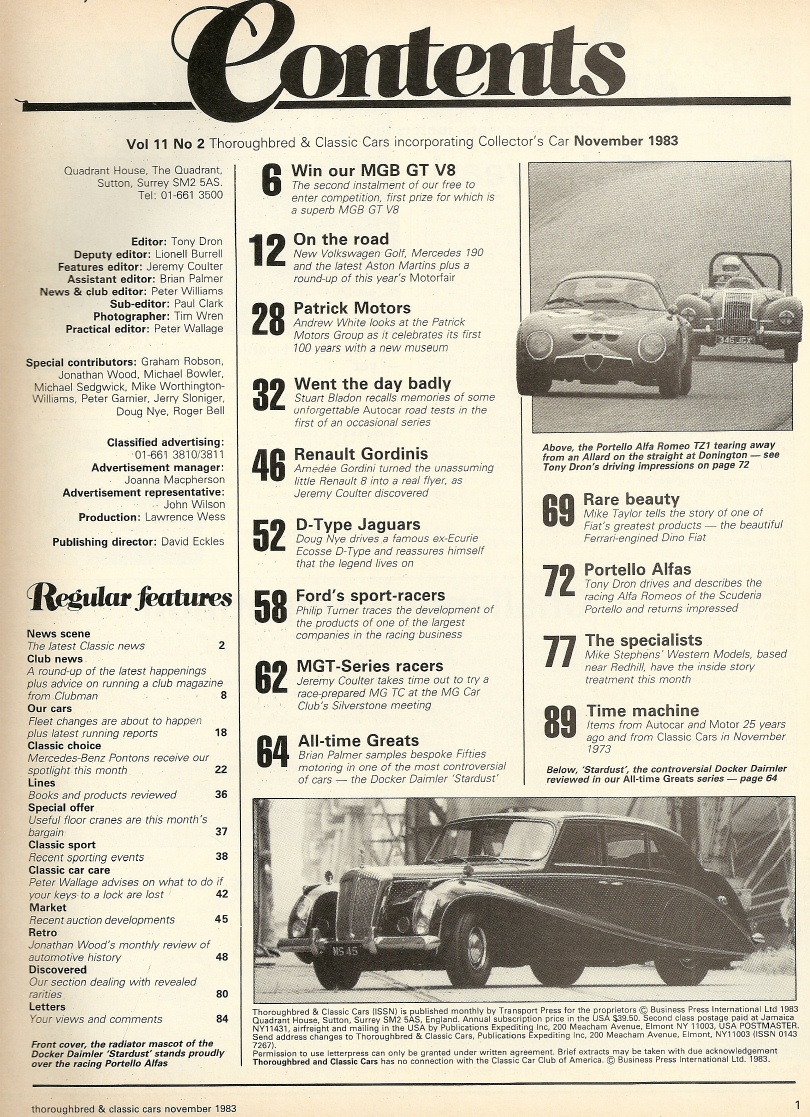 Reviews THOROUGHBRED & CLASSIC CARS 1983 NOV - ALFA TZ, MR RACER