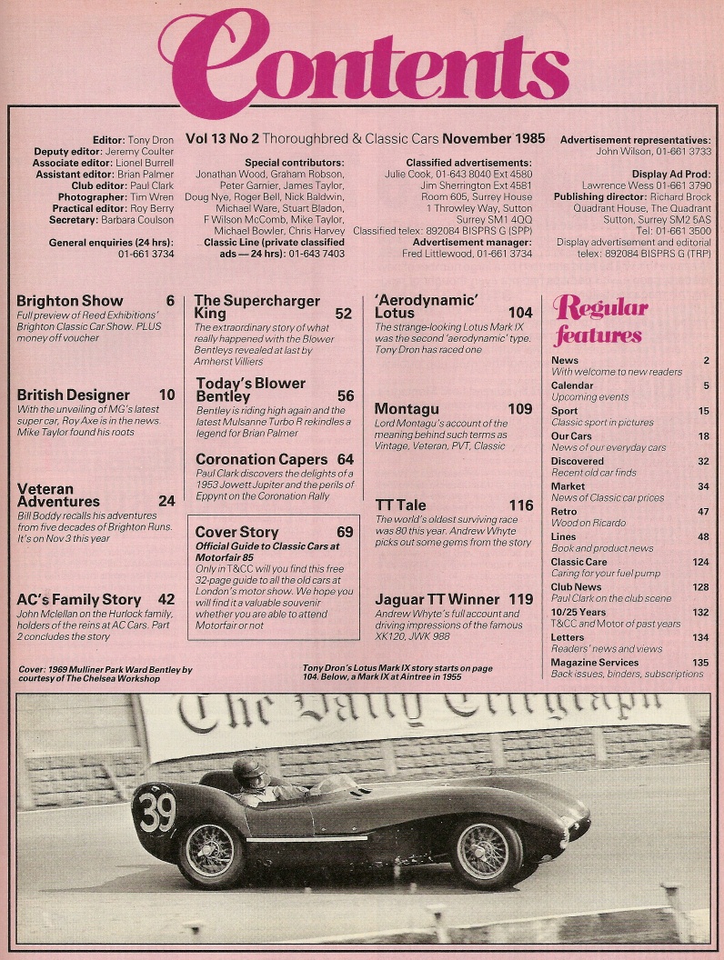 THOROUGHBRED & CLASSIC CARS 1985 NOV - LOTUS 9, JWK 988