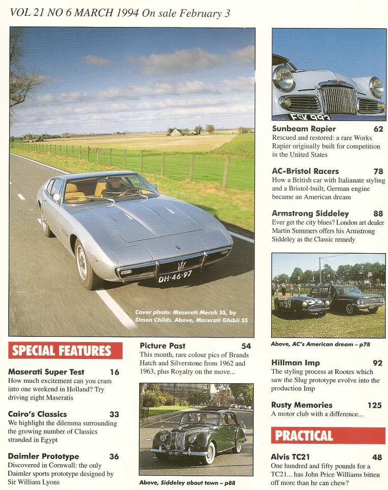 Reviews THOROUGHBRED & CLASSIC CARS 1994 MAR - MASERATI Spcl, RAPIER, ACE-BRISTOL, IMP