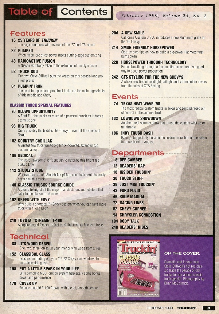 Reviews TRUCKIN' 1999 FEB - CLASSIC SPECIAL, F-100 FIREWALL, 99 CHEVY BILLET GRILL,INDY