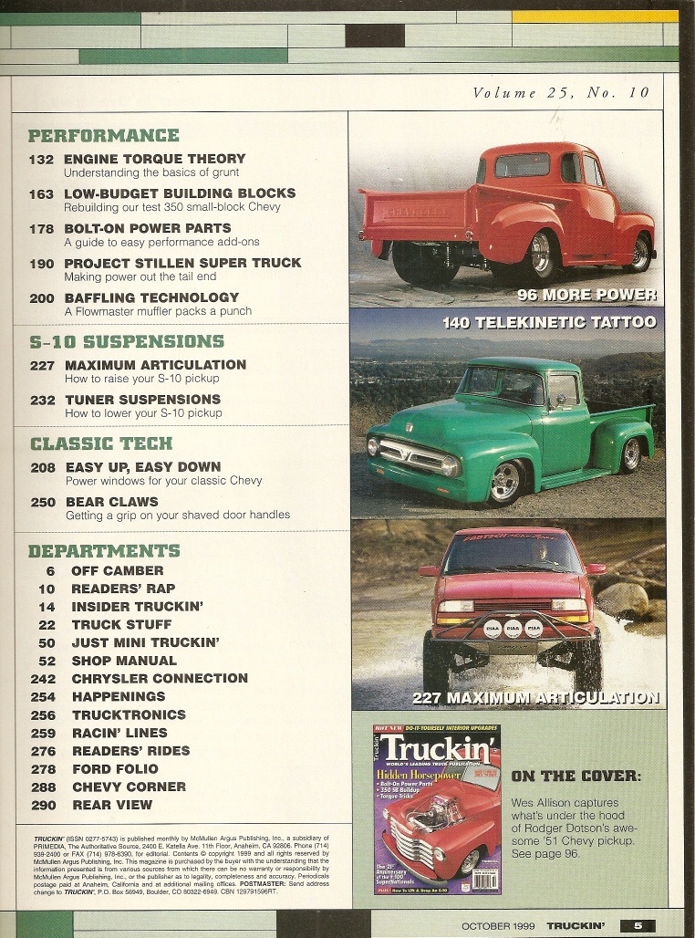 Reviews TRUCKIN' 1999 OCT - BOLT-ON PWR, 350 SB BUILDUP, TORQUE TRIX, F-100 SUPER NATS