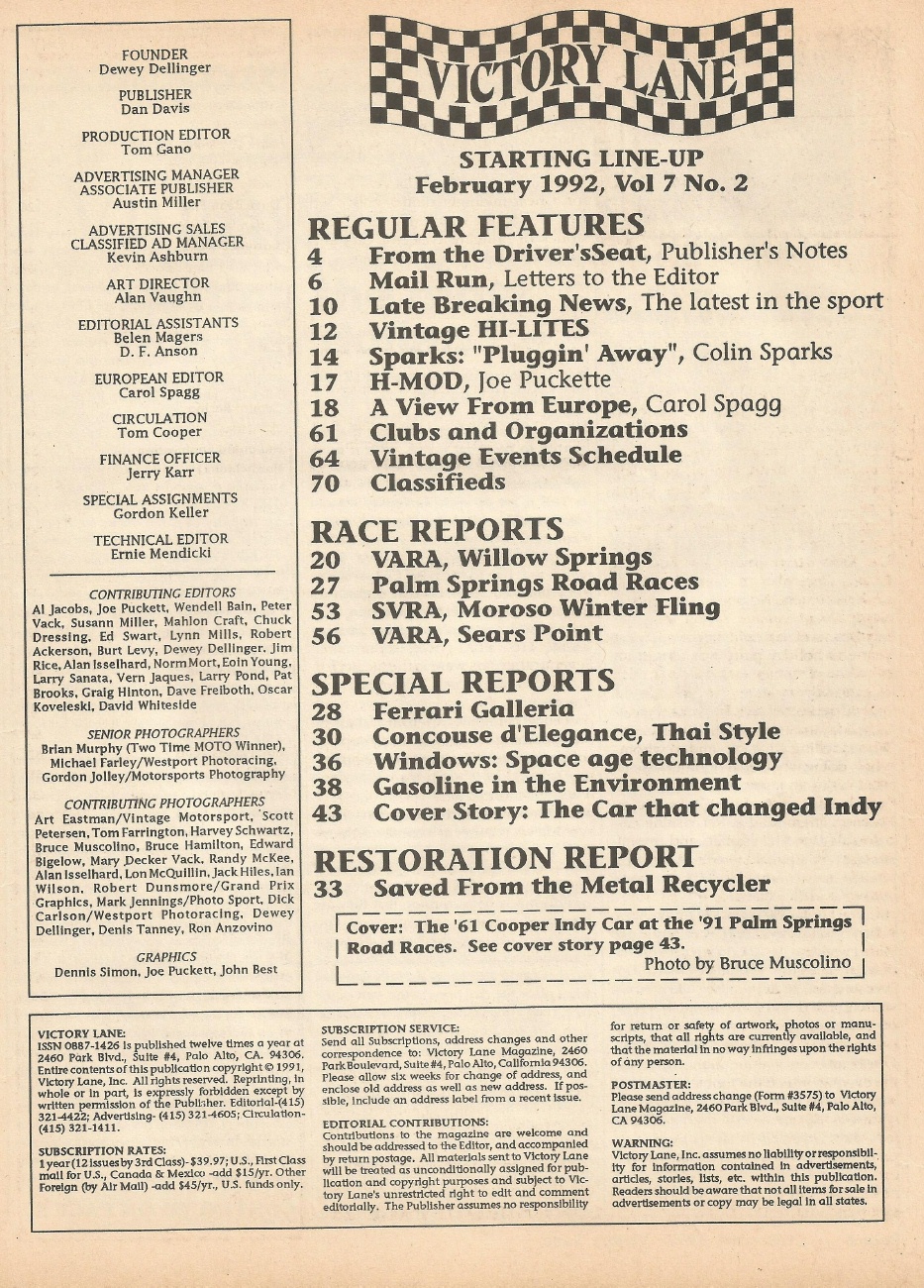 Reviews VICTORY LANE 1992 FEB - THE VINTAGE & HISTORIC RACING NEWS MAGAZINE