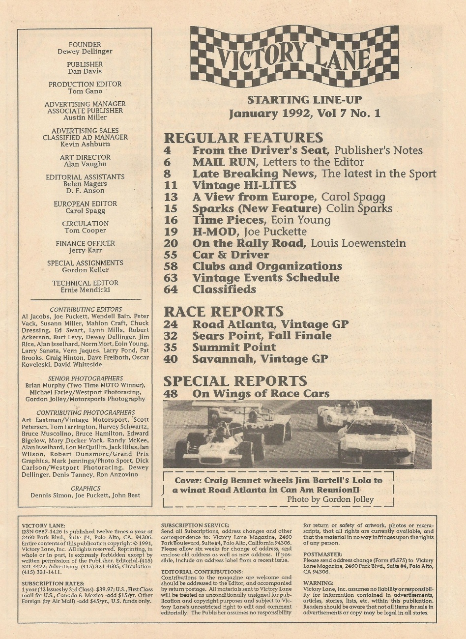 Reviews VICTORY LANE 1992 JAN - THE VINTAGE & HISTORIC RACING NEWS MAGAZINE